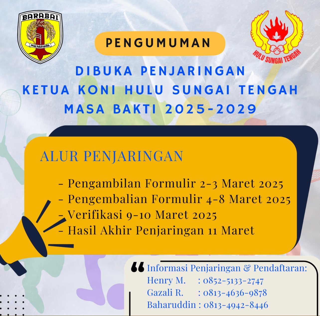 Narasiaktual.com – Hulu Sungai Tengah – Komite Olahraga Nasional Indonesia (KONI) Hulu Sungai Tengah resmi membuka penjaringan calon ketua untuk masa bakti 2025-2029. Proses seleksi ini akan berlangsung mulai 2 hingga 11 Maret 2025 dengan beberapa tahapan yang telah ditetapkan.