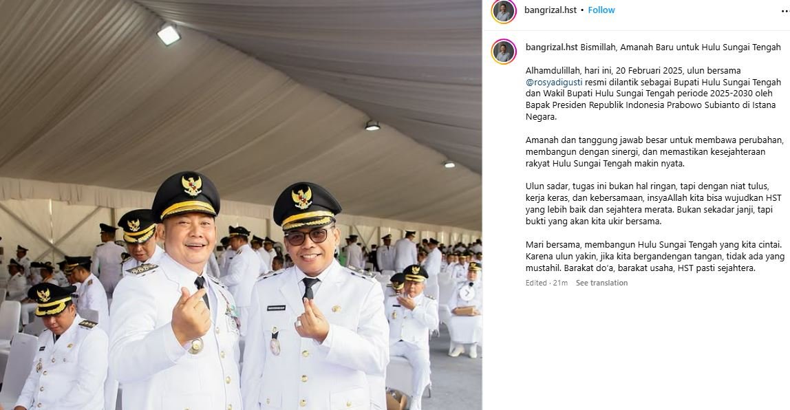 Dalam unggahannya di media sosial @bangrizal.hst Bang Rizal menyampaikan rasa syukurnya setelah proses pelantikan yang berjalan lancar. “Alhamdulillah hari ini 20 Februari 2025 ulun bersama @rosyadigusti resmi dilantik sebagai Bupati dan Wakil Bupati Hulu Sungai Tengah periode 2025-2030 oleh Bapak Presiden Republik Indonesia Prabowo Subianto” tulisnya.
